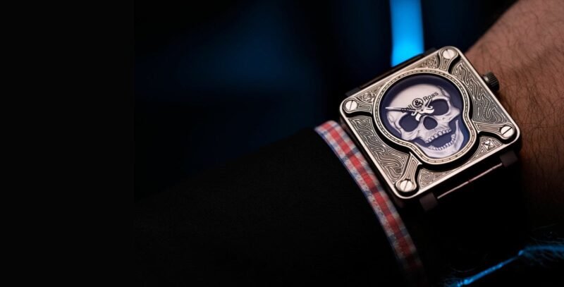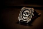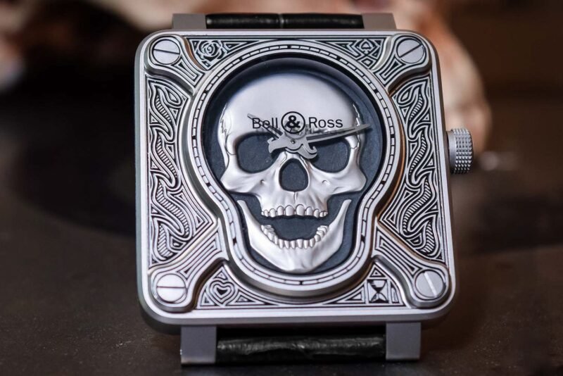 *Hidden in the flames are other common tattoo motifs: a rose, a heart, an hourglass and the ace of spades. The skull itself is rendered in the realistic relief, which adds to sculptural quality of the watch. The hands aren’t what we typically mean when we say sword ‘style’ hands– here they’re actual swords*
