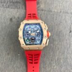 👉🏽 Powered by original Japanese self-winding automatic machinery, Stainless-steel Tose gold tonneau shaped case with open back, Anti-reflective sapphire glass on a black chronograph dial, fastened by a high grade Red silicone strap with deployment buckle.