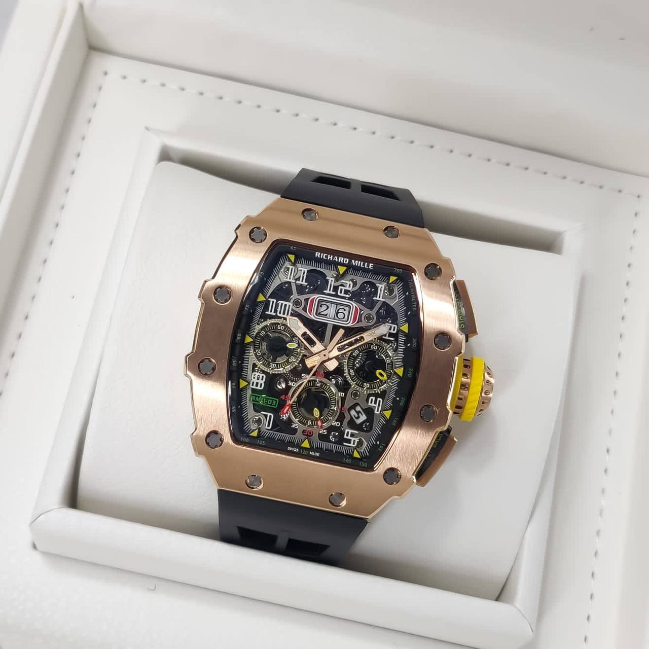 👉🏽 Powered by original Japanese self-winding automatic machinery, Stainless-steel rosegold tonneau shaped case with open back, Anti-reflective sapphire glass on a black chronograph dial, fastened by a high grade black silicone strap with deployment buckle.
