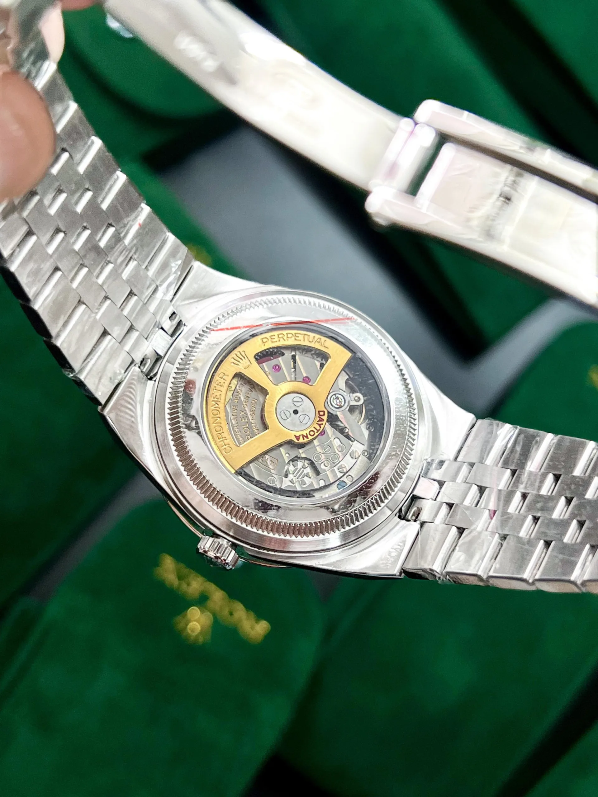-Open caseback with Swiss detailing & Rolex Original One-Click Open Lock.